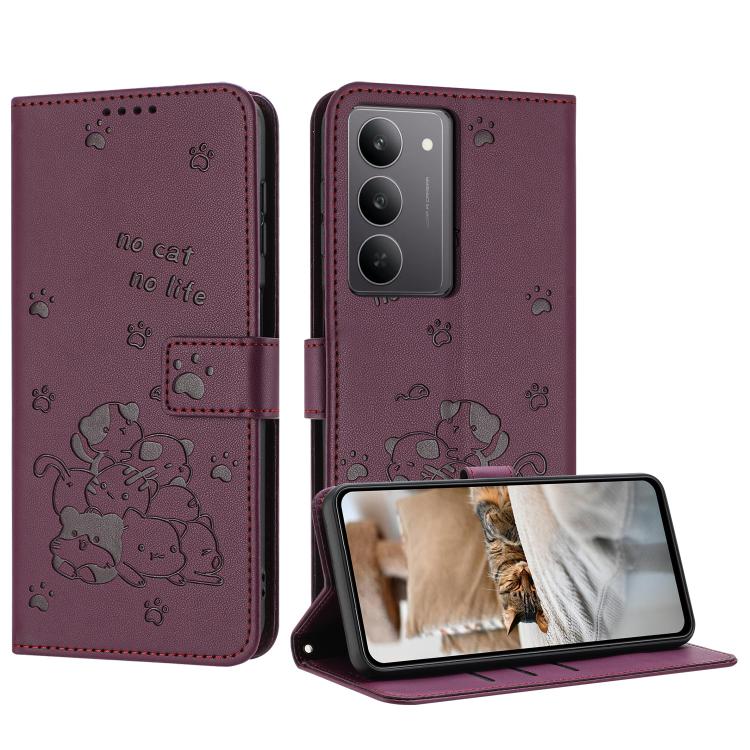 Описание Чехол-книжка Embossed Kitten Phone Leather на Realme C75 / V60 Pro - винно-красный