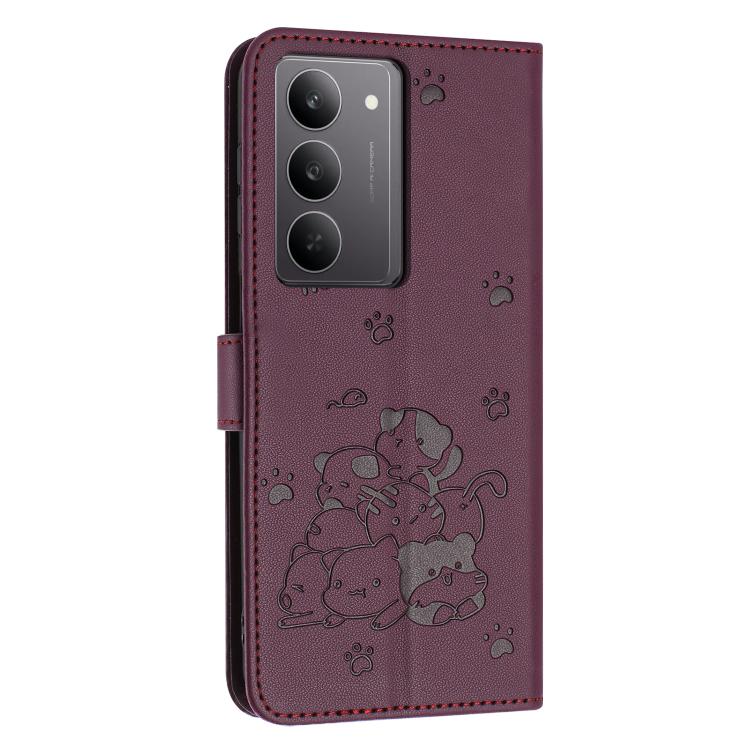 Чехол-книжка Embossed Kitten Phone Leather на Realme C75 / V60 Pro - винно-красный