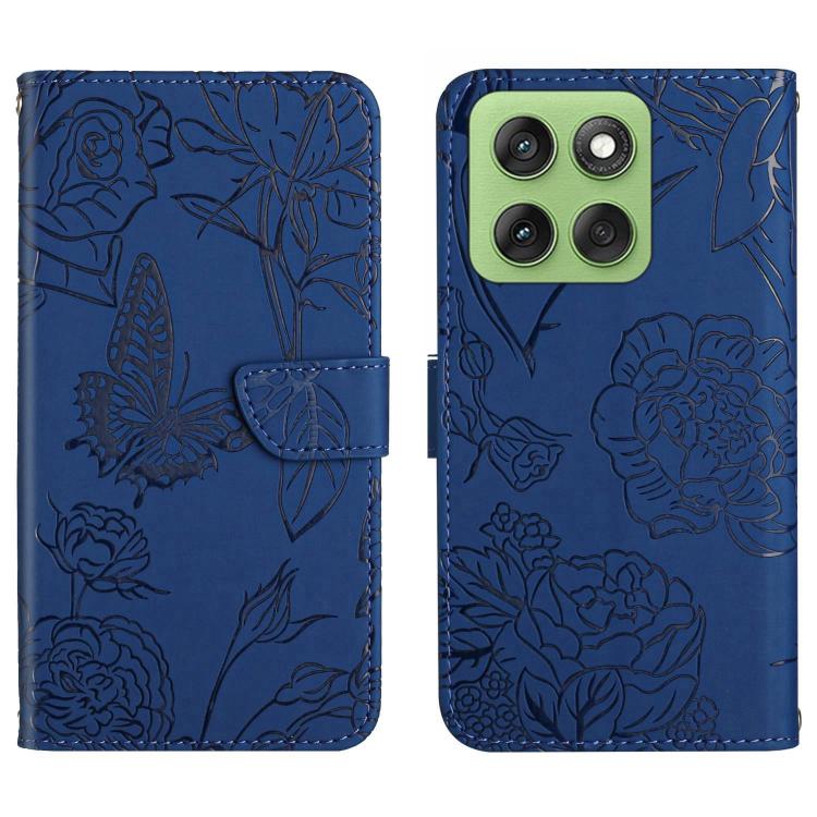 Синий чехол-книжка с изящным тиснением бабочки и цветочными узорами для Motorola Edge 60 Pro
