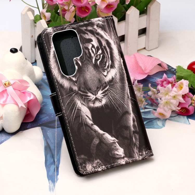 Характеристики Чехол-книжка Colored Drawing Pattern для Samsung Galaxy S22 Ultra 5G - Black White Tiger