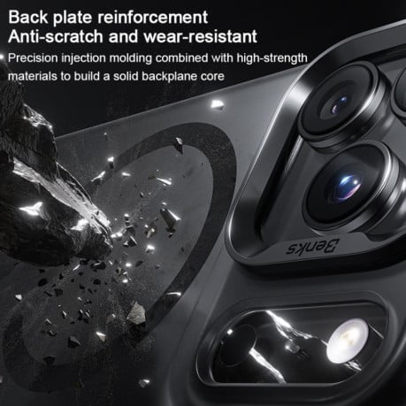 Benks зарекомендовал себя производителем высококачественных аксессуаров, где инженерные решения сочетаются с продуманной эргономикой. Данная модель действительно изготовлена брендом с применением запатентованной технологии BE-cohere™ coating — покрытия, которое придает корпусу шелковистость и антискользящие свойства. Микроматовая текстура задней панели создает эффект легкого песка (hazy light sand), формируя уникальную эстетику и комфортный хват. Поликарбонатная основа усиливается слоем TPU по периметру, что обеспечивает гибкость в критических точках и рассеивание энергии удара. Нано-олеофобное покрытие физически отталкивает жир и влагу, сохраняя поверхность сухой даже при интенсивном использовании. Benks применяет прецизионное литье под давлением для формирования усиленного ядра задней панели, устойчивого к царапинам и деформации. Встроенное магнитное кольцо из редкоземельных элементов гарантирует стабильное притяжение к MagSafe-зарядкам и держателям, не теряя мощности со временем.
