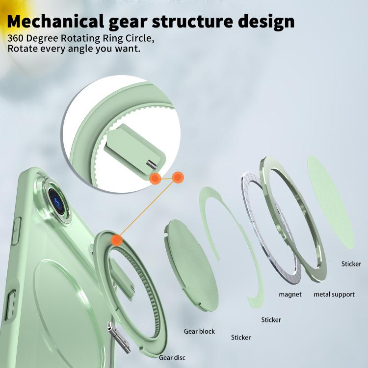 Двокомпонентна структура поєднує еластичний TPU і жорсткий полікарбонат. Перший амортизує удари, другий розподіляє навантаження по всій поверхні. Зелений відтінок не вигорає, а гладка текстура легко очищається вологими серветками — відбитки пальців стираються без зусиль. Накладка розроблена Kalebol — виробником, що спеціалізується на функціональних аксесуарах з інженерними рішеннями. В основі лежить механізм редукторного типу: металева опора, шестеренний диск, фіксатор і магнітне кільце працюють як єдина система. Така схема витримує десятки тисяч циклів без люфту, забезпечуючи плавне обертання і стабільну фіксацію кута нахилу при будь-яких сценаріях використання.