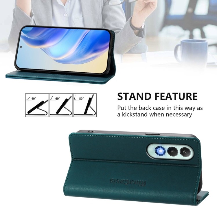 Елегантна книжка Retro Skin Feel Business Magnetic створена для OnePlus Nord CE 4 і підкреслює діловий стиль. Преміальна оздоблення в глибокому зеленому відтінку, тиснення RimaCasis і акуратна прошивка формують охайний зовнішній вигляд. Всередині — 2 слоти для карток і кишеня для готівки, а магнітна застібка надійно фіксує кришку. Перфорація у динаміка дозволяє говорити з закритою кришкою. Підставка з кутами 40°/60°/80° звільняє руки. Вбудований шар RFID‑блокировки захищає безконтактні картки. Повна 360° ударостойкость і сумісність з беспроводной зарядкой. комплектація: аксесуар.