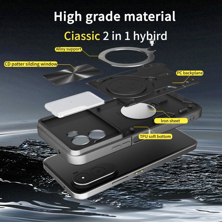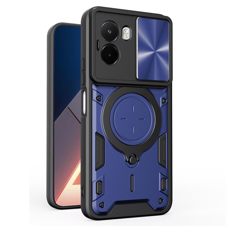 Преміальний захист для Xiaomi Poco M7 4G у стильному синьому виконанні з ефектною CD-фактурою і розсувною шторкою камери. Гібридна конструкція з TPU і протиударного полікарбонату гарантує надійність при падіннях. Вбудована металева підставка з поворотом на 360° і нахилом 180° перетворює смартфон на медіацентр для відео, дзвінків і навігації. Магнітна пластина забезпечує миттєву фіксацію на автомобільному тримачі. Елегантний дизайн з дисковим візерунком підкреслює статус власника, а шторка об'єктива захищає приватність одним рухом пальця.