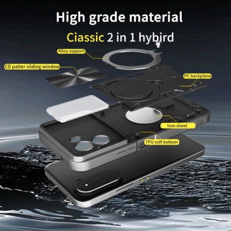 Класична гібридна архітектура 2 в 1 об'єднує еластичний TPU-шар по периметру і міцну полікарбонатну панель ззаду. М'яка основа амортизує удари і щільно охоплює корпус смартфона, виключаючи люфти і скрипи. Тверда задня кришка з CD-текстурою протистоїть подряпинам і деформаціям. Вбудована залізна пластина посилює магнітне зчеплення з тримачами. Антислизьке покриття запобігає вислизанню з рук, а рельєфна поверхня стійка до відбитків пальців і забруднень. Точні вирізи для портів і кнопок забезпечують комфортне керування без знімання захисту.