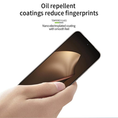 Закалене японське AGC-скло товщиною 0,33 мм поєднує міцність з делікатністю — не потовщує корпус, але створює бар'єр проти механічних пошкоджень. Nano-електроплазменне покриття з олеофобним ефектом відштовхує жирові сліди та вологу, зберігаючи дисплей чистим увесь день. Скошені 3D Arc-краї відшліфовані до гладкості — палець ковзає по периметру без зачепів, створюючи відчуття суцільного екрану. Висока світлопропускна здатність 99% не спотворює картинку, не знижує контрастність AMOLED-матриці. Сенсорна чутливість залишається миттєвою завдяки ультратонкій структурі і повному приклеюванню по всій площі без повітряних зазорів.